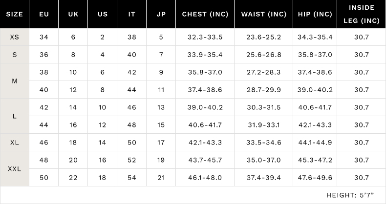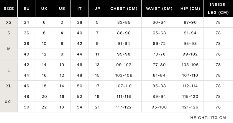 Inside Leg: Measure from the top of inner thigh down to the bottom of the ankle.
